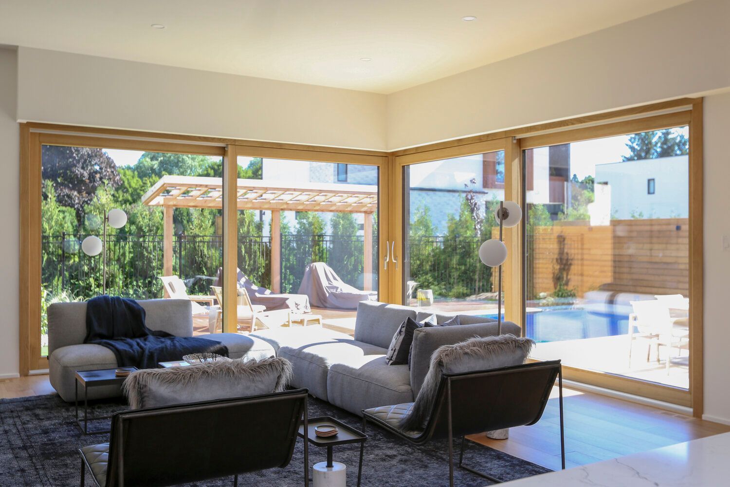 Our premium luxury Unilux windows and doors made of oak and aluminum bring this stunning dream home to life! Sunlight seeps through the unobstructed tilt & turn windows and floor to ceiling lift and slide patio doors to add to the warmth of this contemporary space. The highly insulated windows and doors are extremely energy efficient, so the homeowners will not be affected by the changing temperatures of the outside.