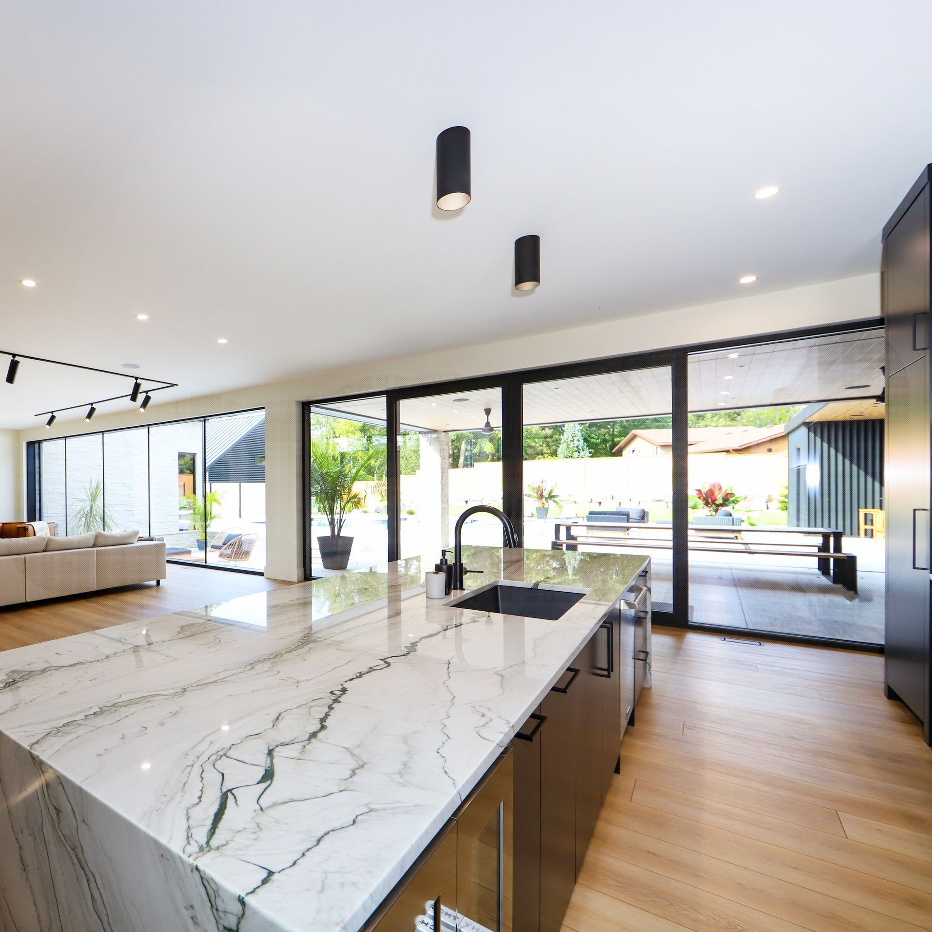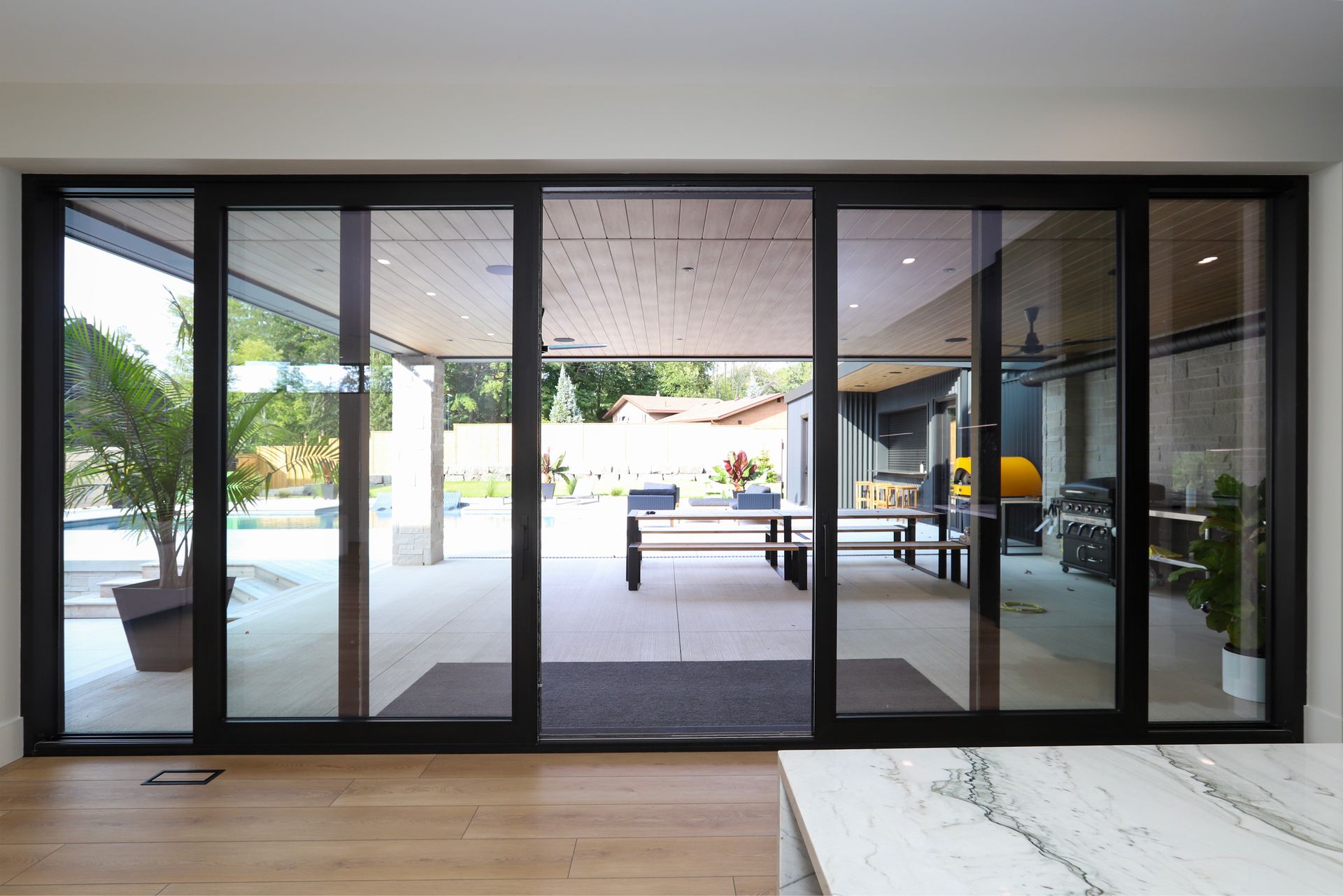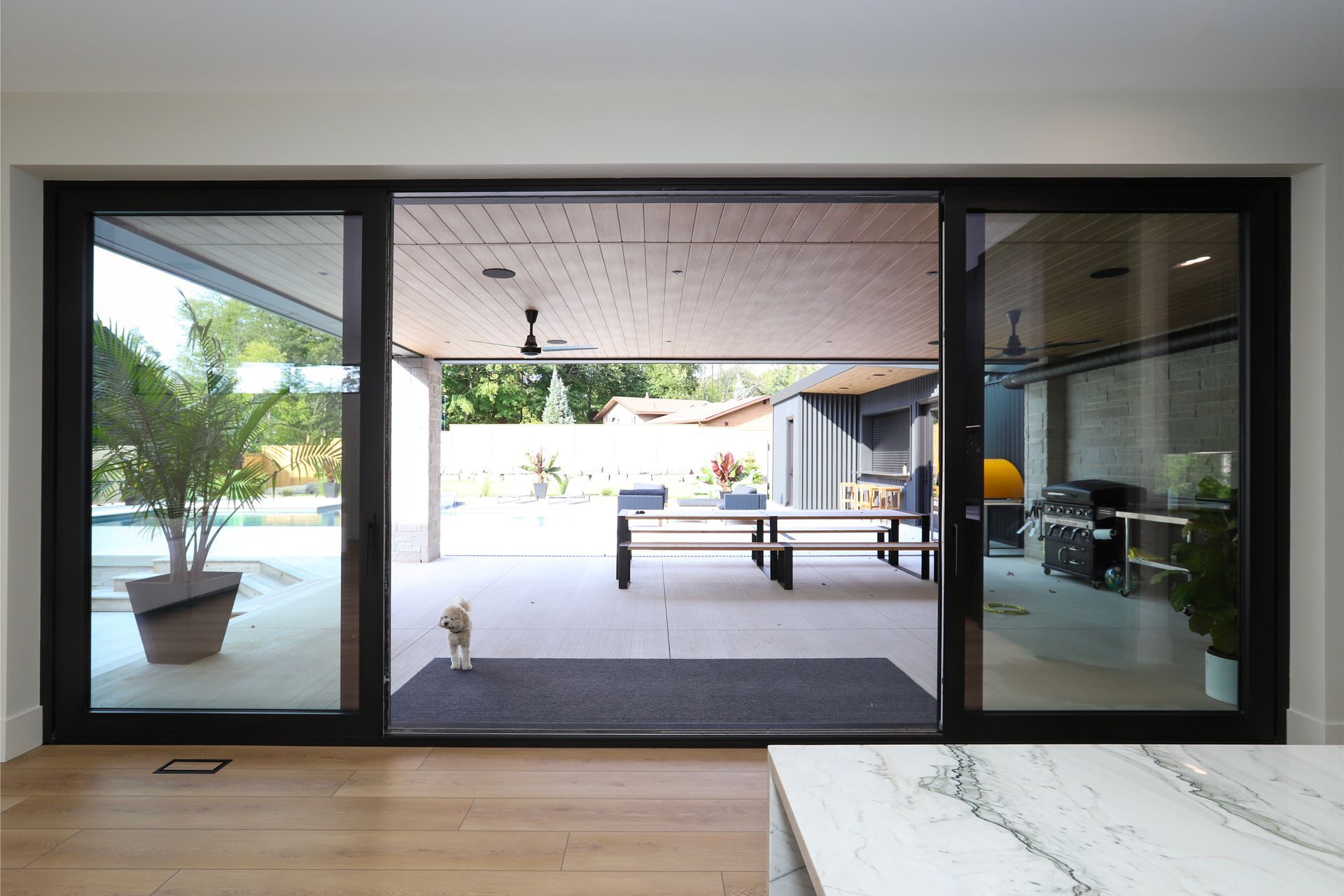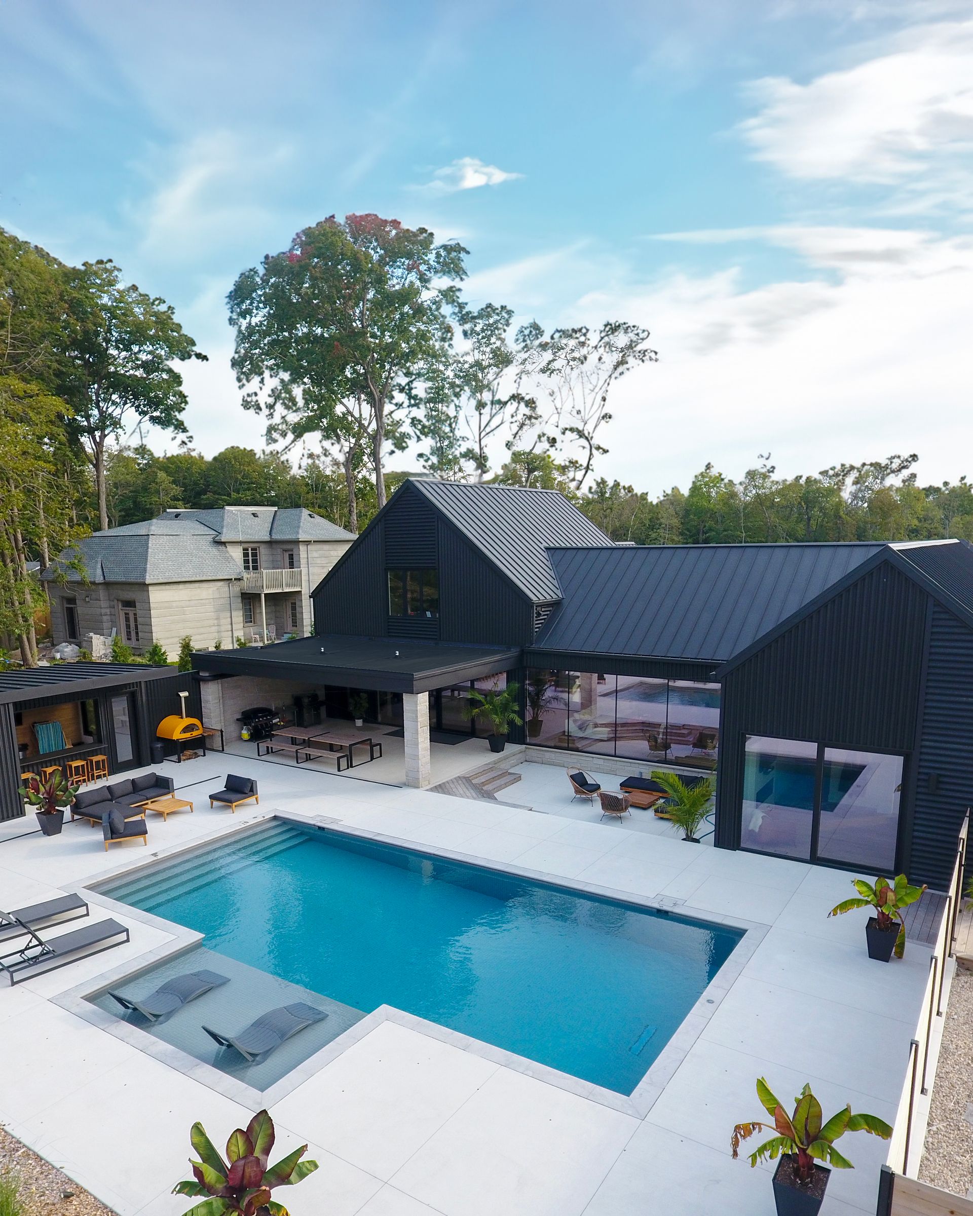 This stunning contemporary home, designed with Raven windows and doors, offers a seamless connection between indoor and outdoor living. The back of the house features expansive floor-to-ceiling windows, allowing uninterrupted views of the inviting blue pool, a chic bar, and a custom pizza oven area, creating the perfect backdrop for entertaining.