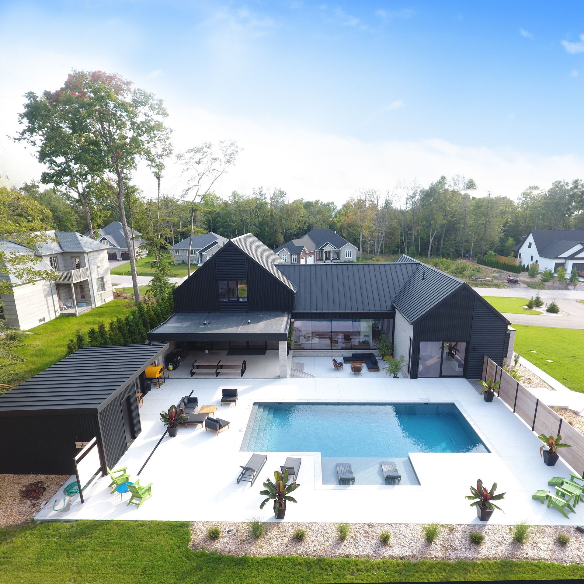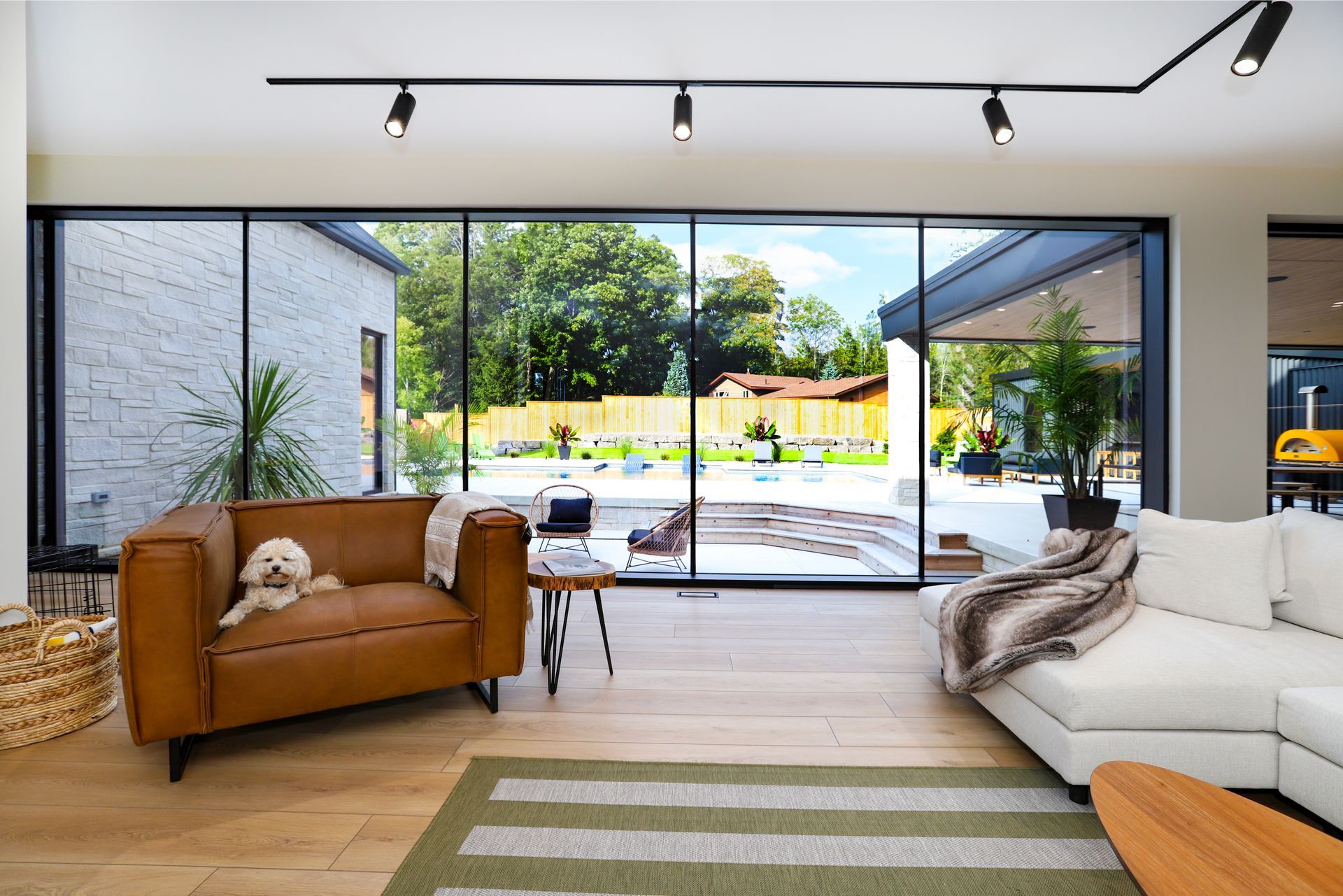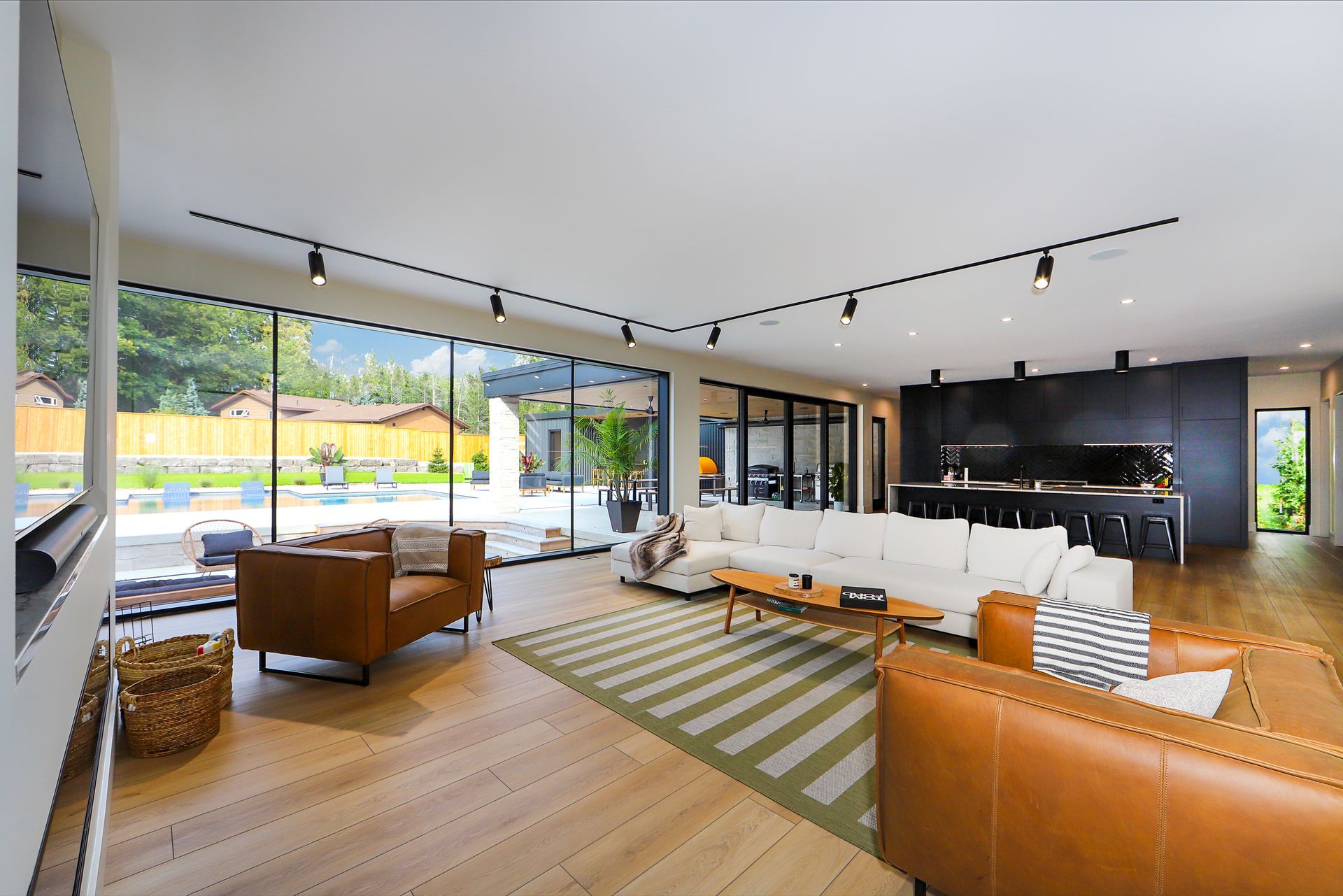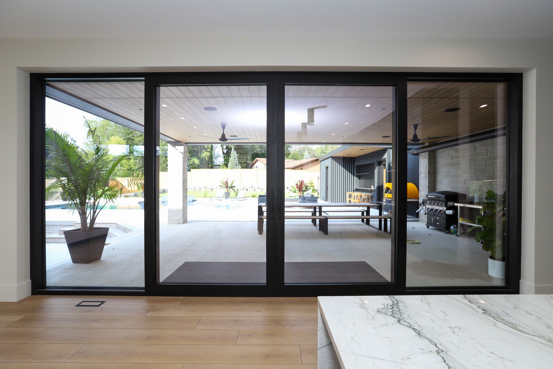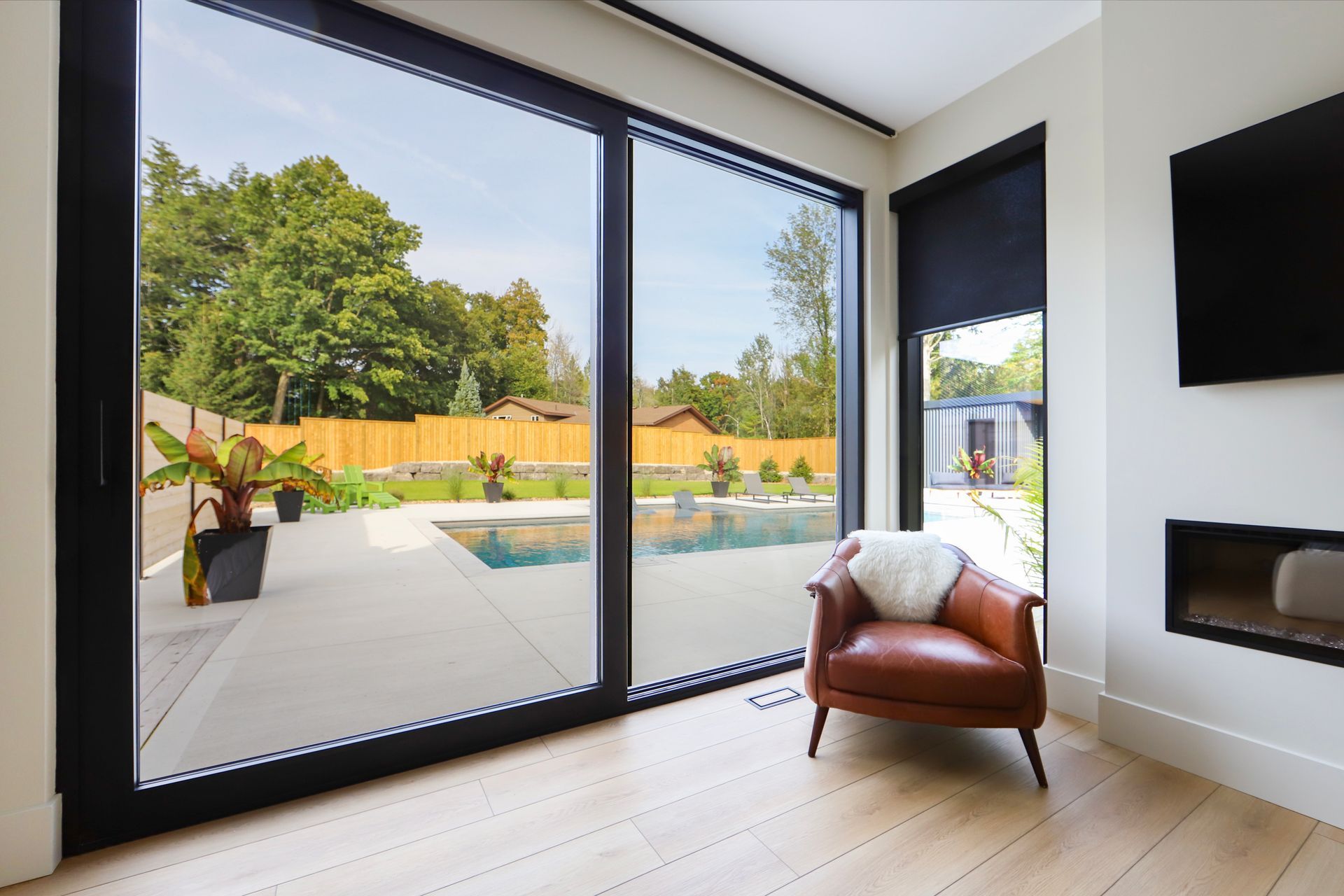 This stunning contemporary home, designed with Raven windows and doors, offers a seamless connection between indoor and outdoor living. The back of the house features expansive floor-to-ceiling windows, allowing uninterrupted views of the inviting blue pool, a chic bar, and a custom pizza oven area, creating the perfect backdrop for entertaining.