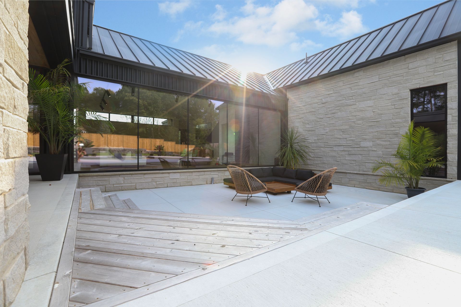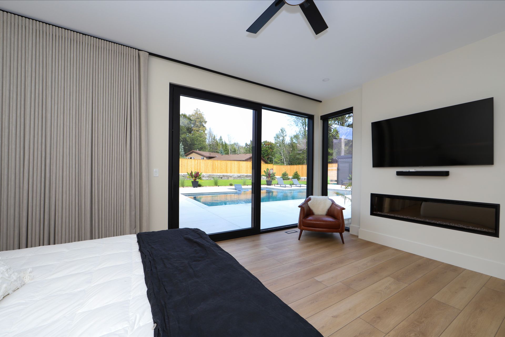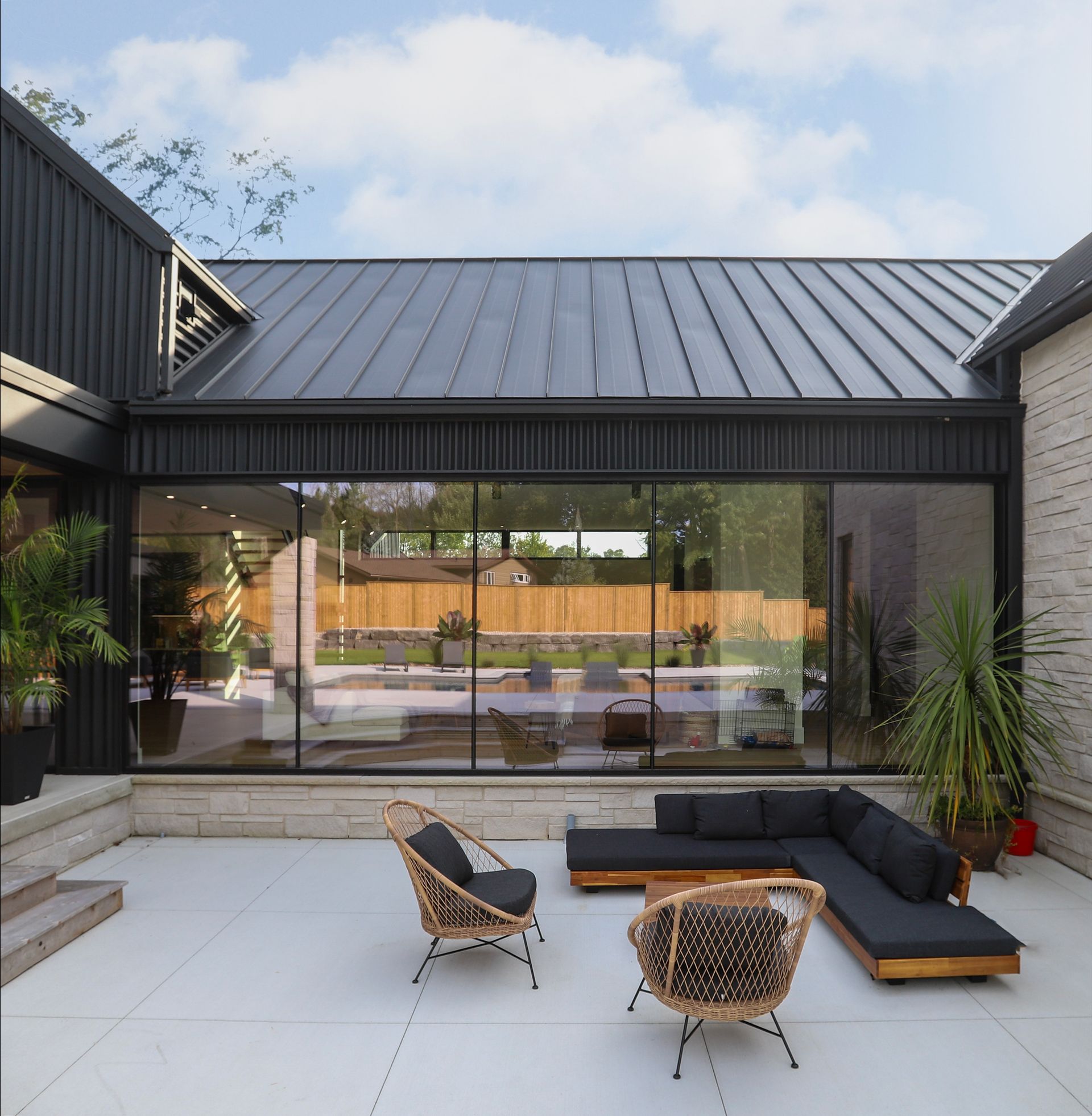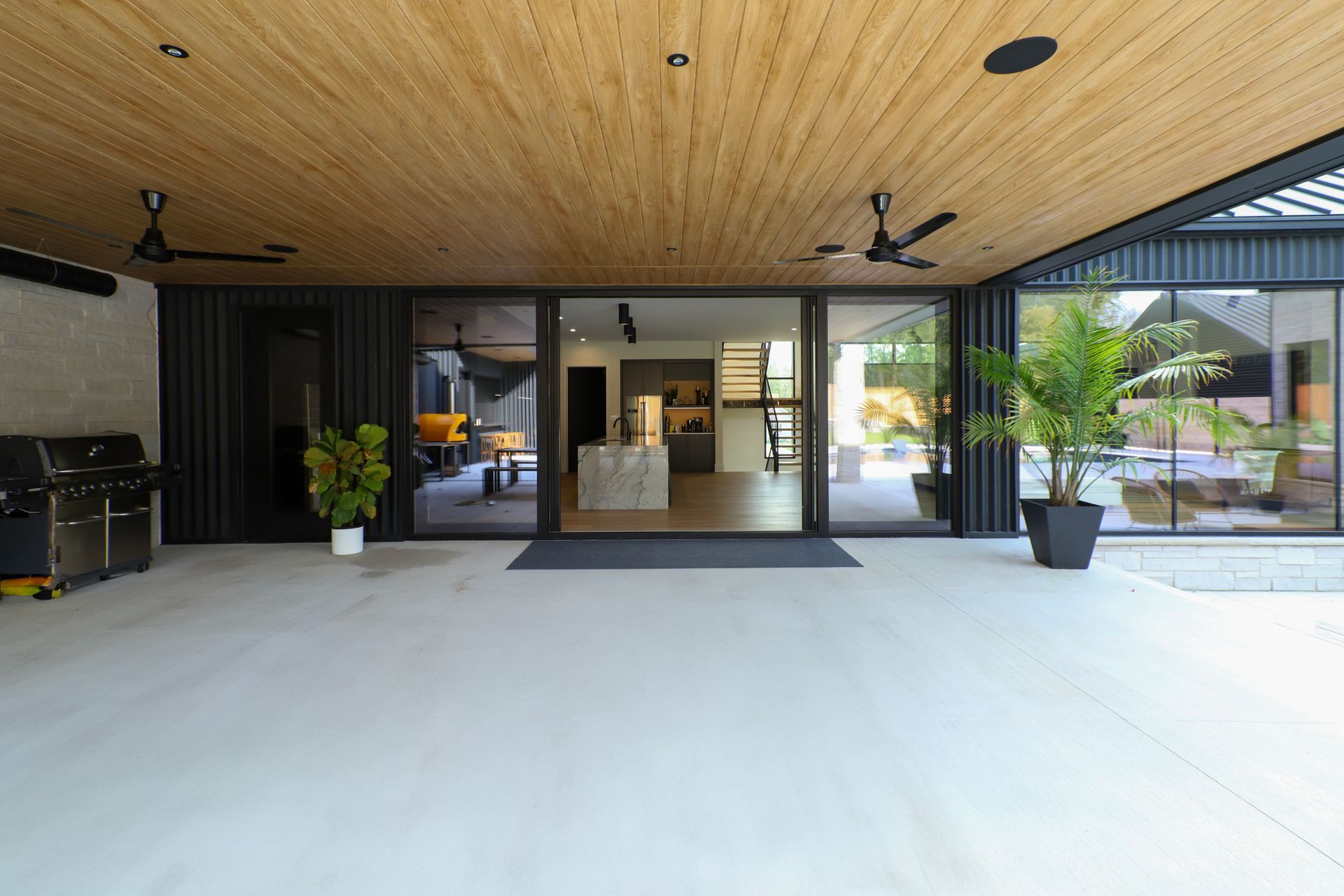 This stunning contemporary home, designed with Raven windows and doors, offers a seamless connection between indoor and outdoor living. The back of the house features expansive floor-to-ceiling windows, allowing uninterrupted views of the inviting blue pool, a chic bar, and a custom pizza oven area, creating the perfect backdrop for entertaining.