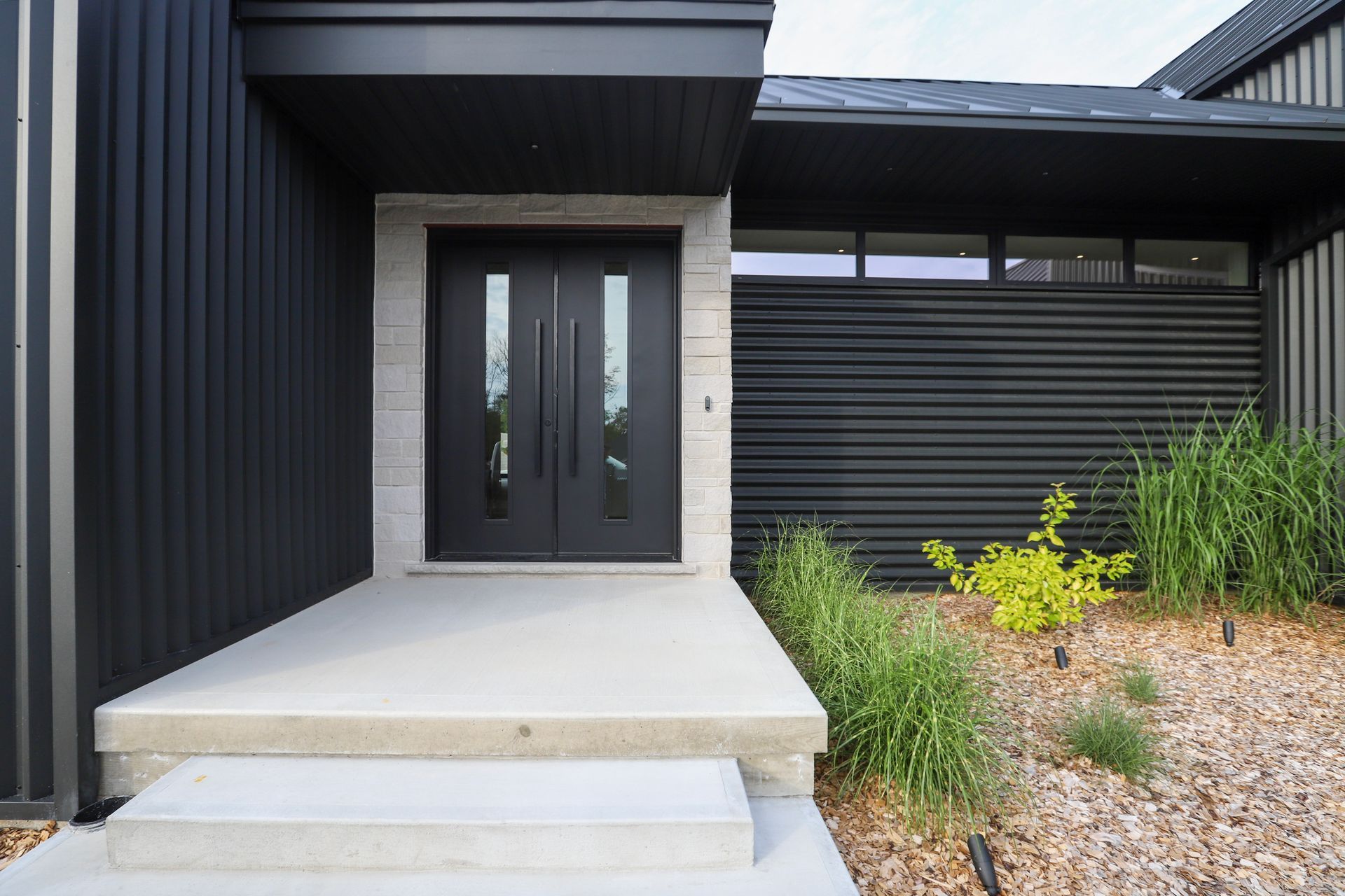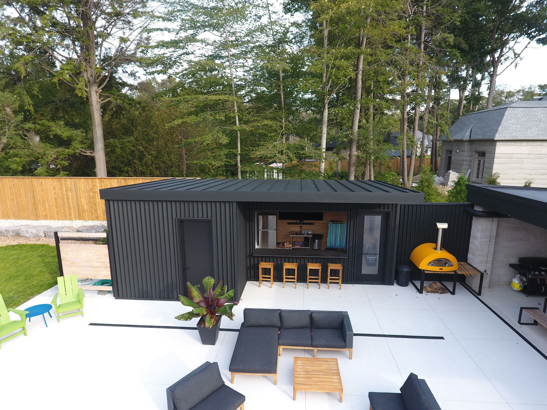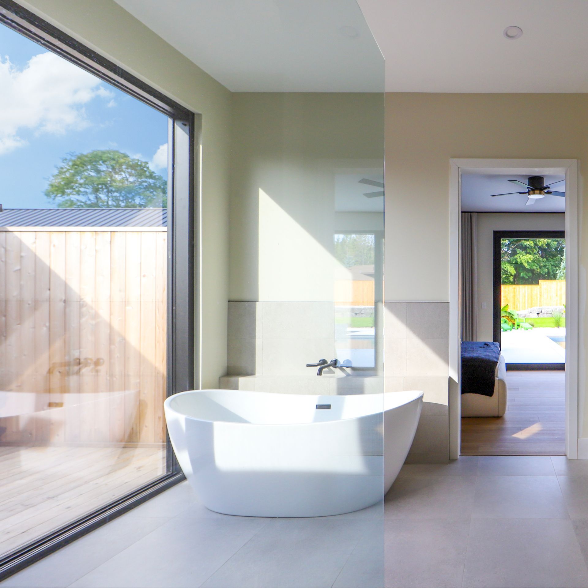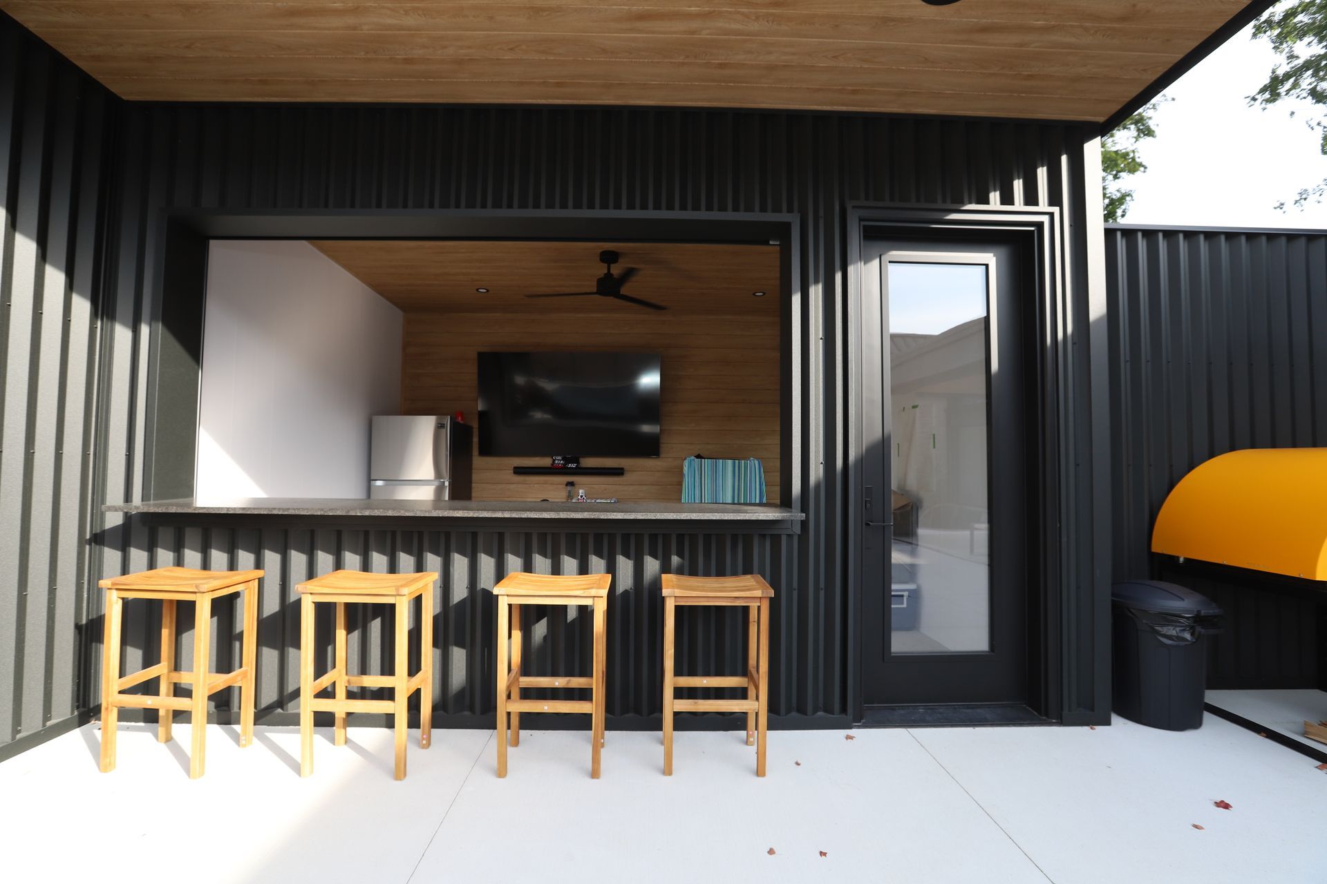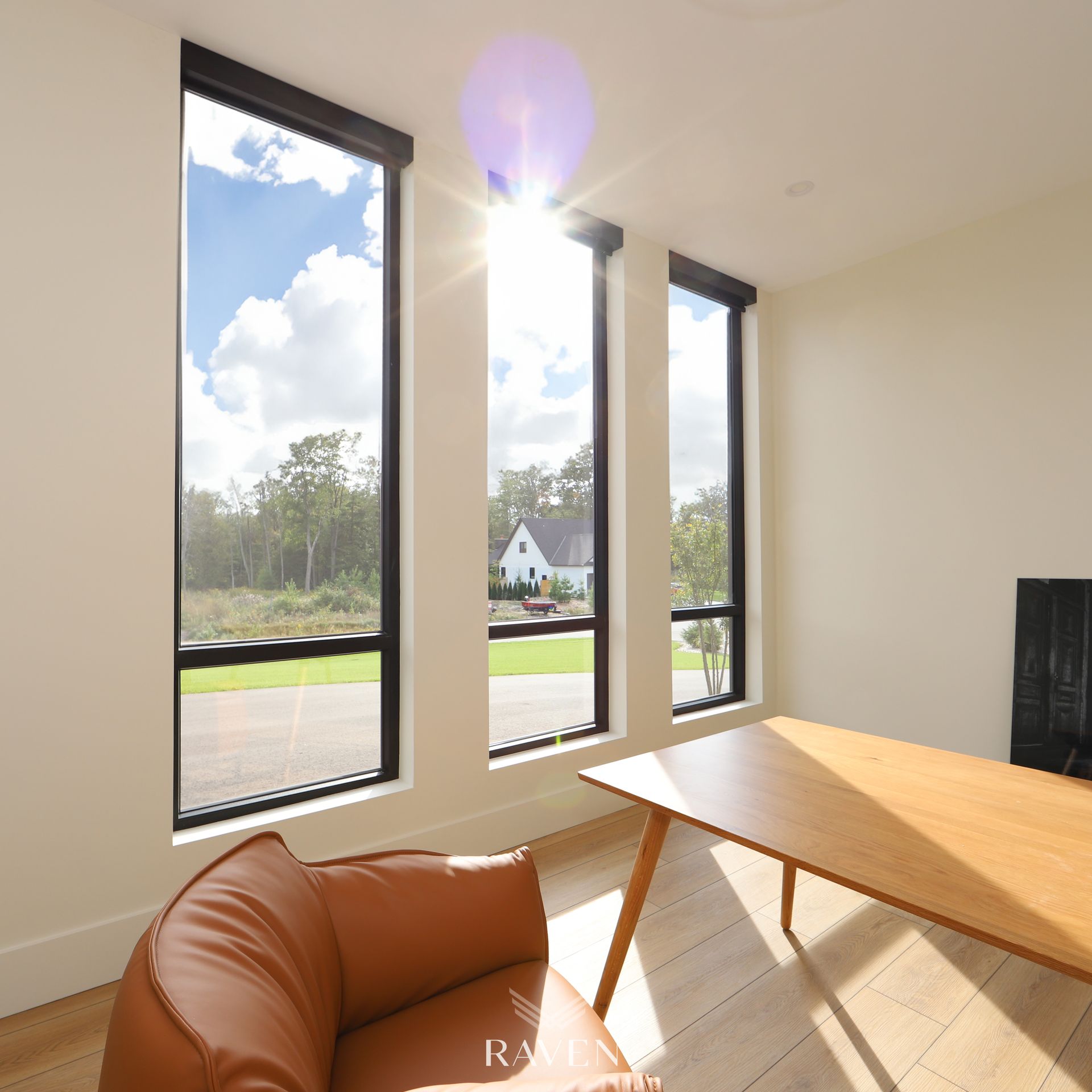 This stunning contemporary home, designed with Raven windows and doors, offers a seamless connection between indoor and outdoor living. The back of the house features expansive floor-to-ceiling windows, allowing uninterrupted views of the inviting blue pool, a chic bar, and a custom pizza oven area, creating the perfect backdrop for entertaining.