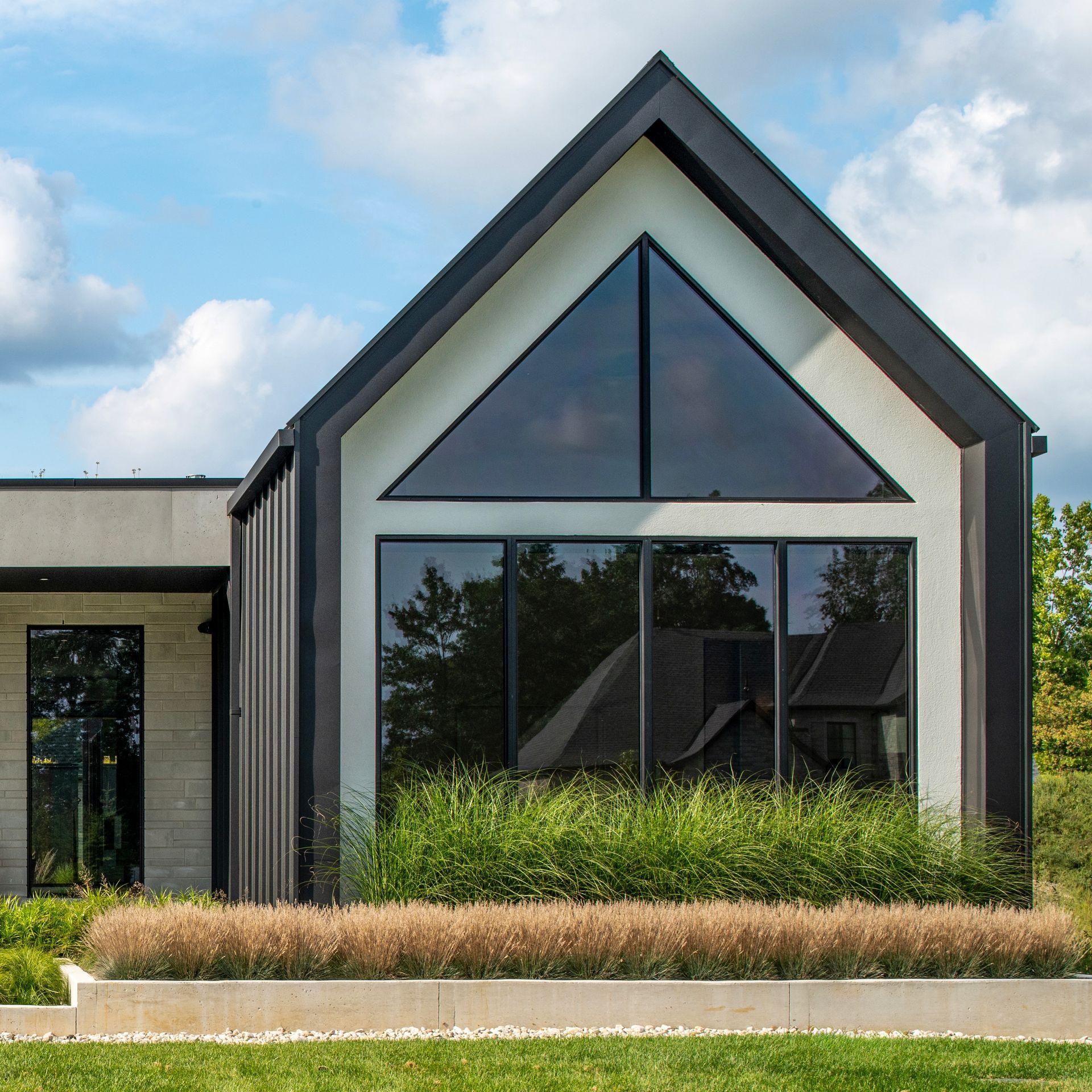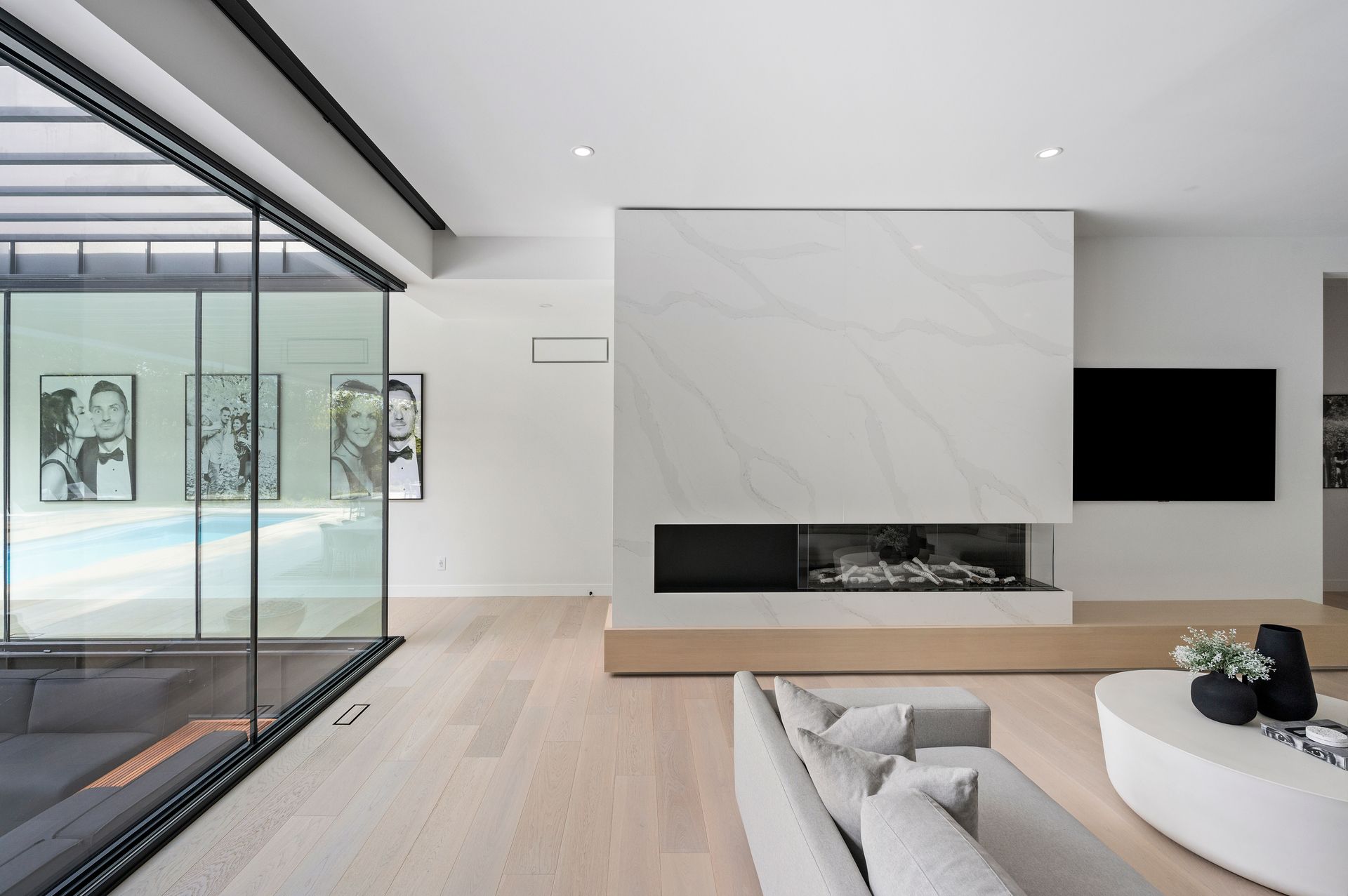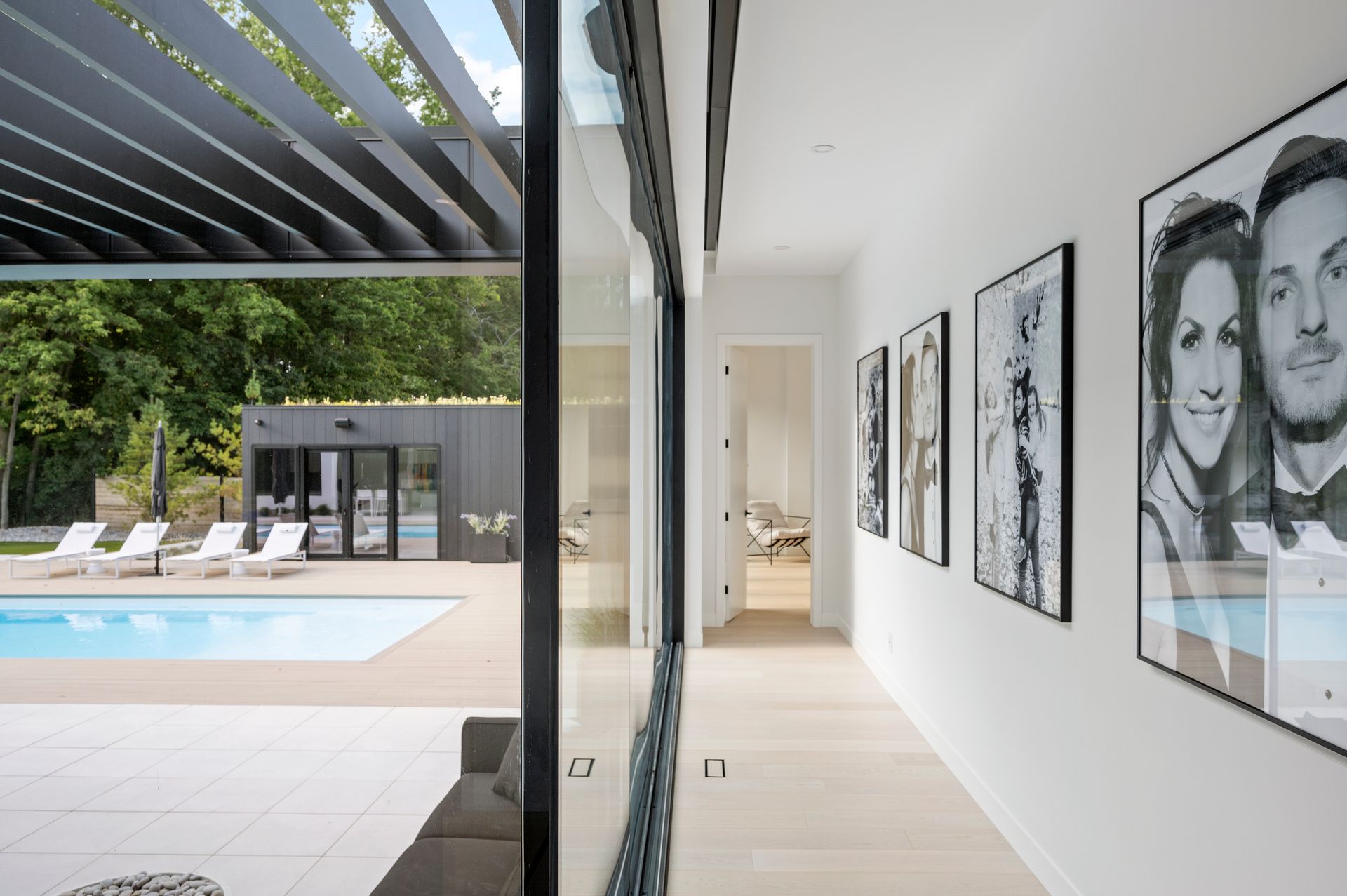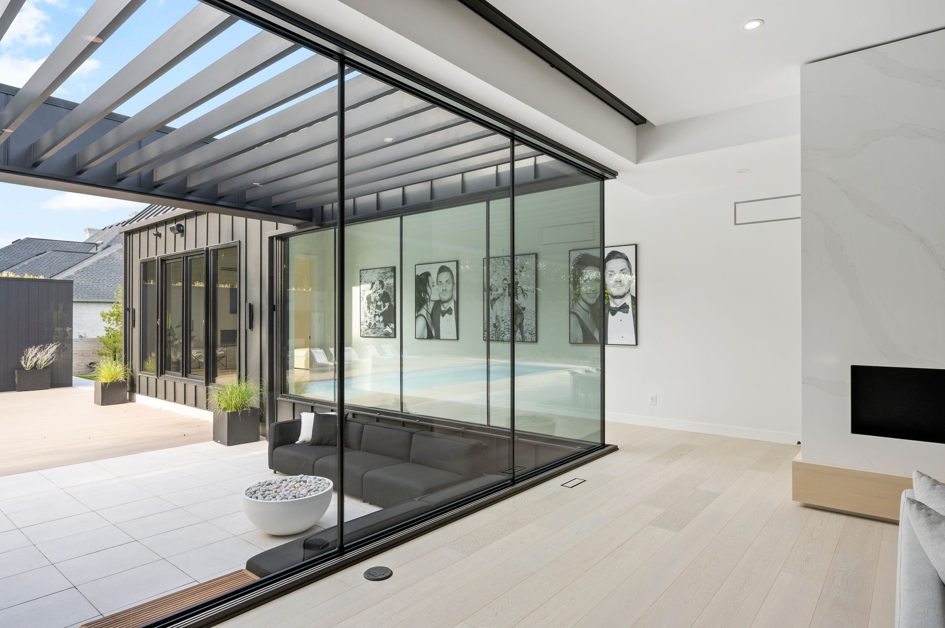 Built by Lux Homes, known for setting the industry standard in London, Ontario, and surrounding areas, the home showcases an innovative use of Raven glass. The back of the house, a true showstopper, features a seamless glass corner between the living room and hallway that extends into the master bedroom. The floor-to-ceiling curtain wall, paired with lift-and-slide doors, creates a sweeping expanse of glass that is as breathtaking from the interior as it is from the exterior.