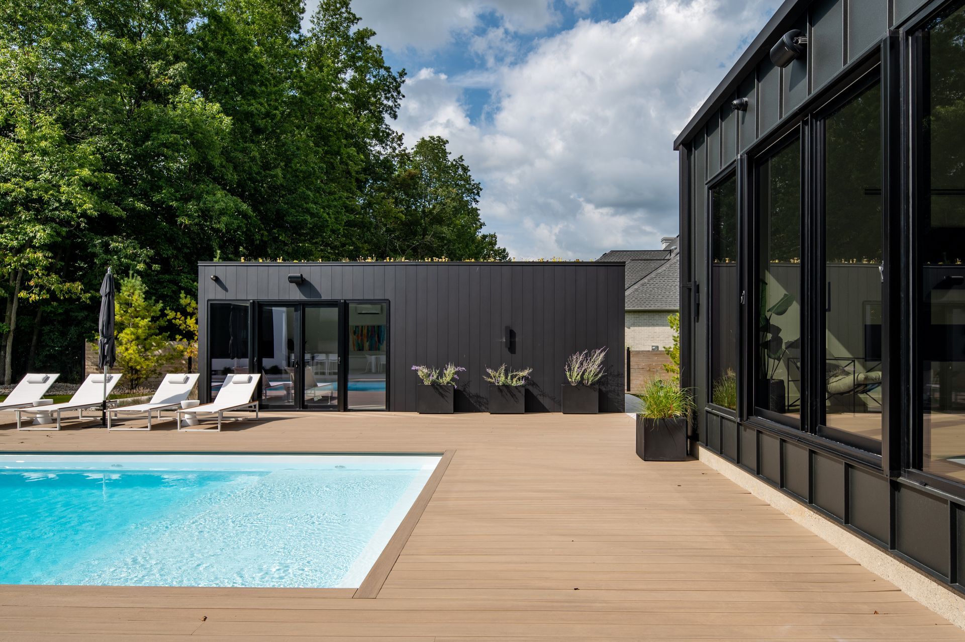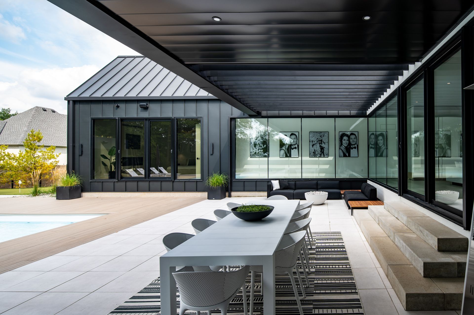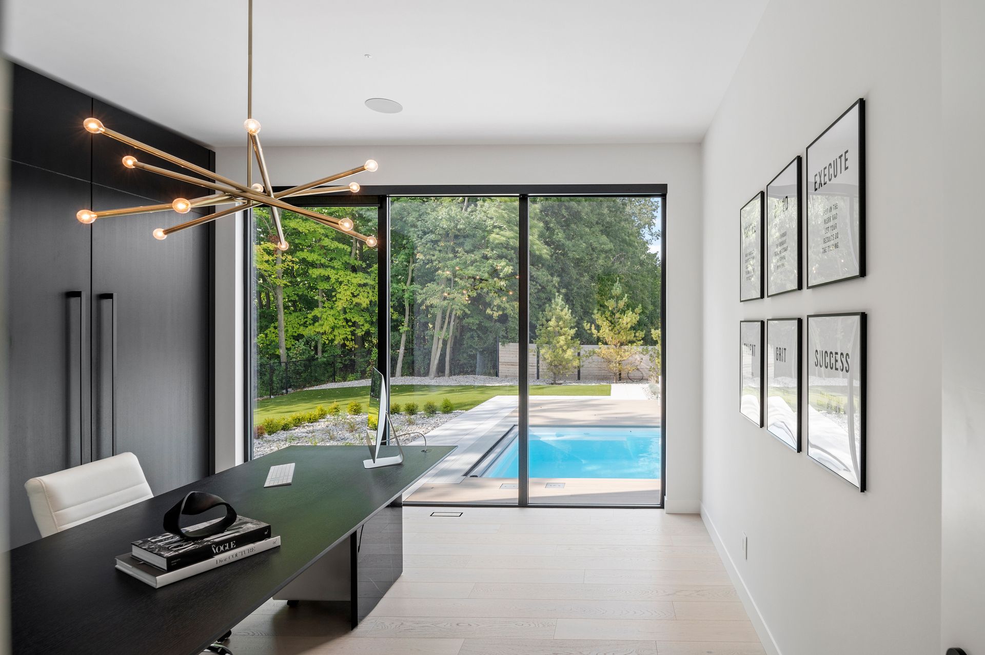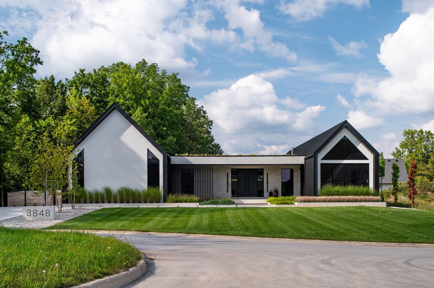 Built by Lux Homes, known for setting the industry standard in London, Ontario, and surrounding areas, the home showcases an innovative use of Raven glass. The back of the house, a true showstopper, features a seamless glass corner between the living room and hallway that extends into the master bedroom. The floor-to-ceiling curtain wall, paired with lift-and-slide doors, creates a sweeping expanse of glass that is as breathtaking from the interior as it is from the exterior.